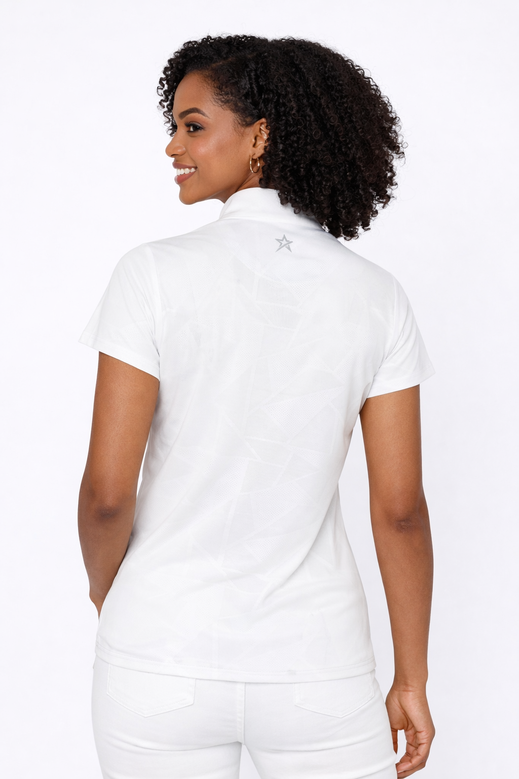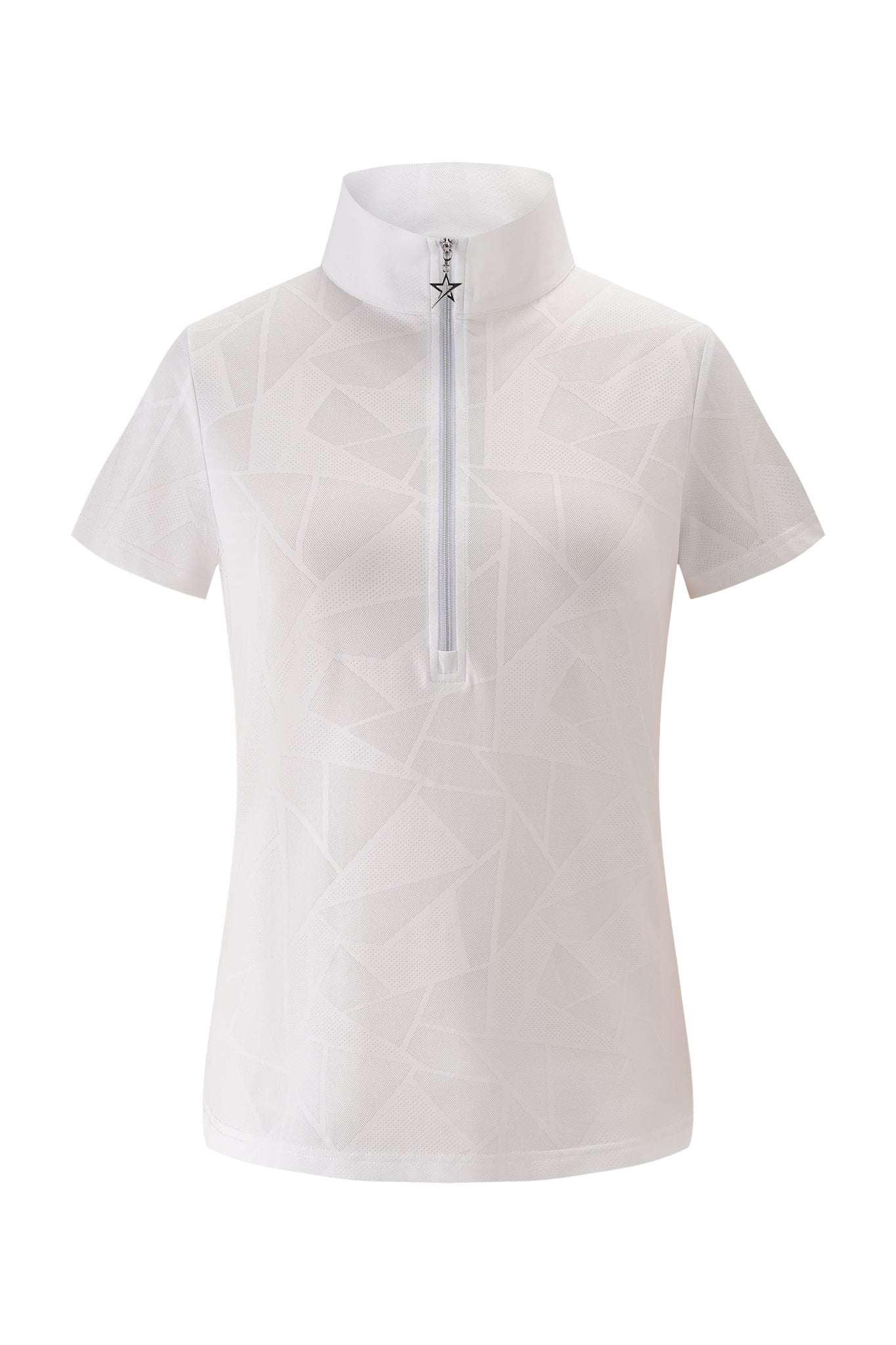 Meet the Mirage Polo, a versatile addition to your wardrobe. Whether you prefer a cap sleeve or a sleeveless style, this elegant plain shirt with unique embossed patter can easily be paired with any outfit, making it a go-to choice for any occasion.