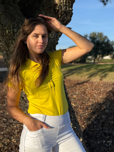 The Lisa. Our Ultra Soft fabric takes comfort to a new level, providing a feel that's gentle on your skin. It features a 4-way Stretch jersey that allows for unrestricted movement and a comfortable fit that adapts to your body's contours. The fabric's breathability ensures you stay cool and comfortable, while its moisture-wicking properties help to keep you dry by drawing sweat away from your skin. The shirt also features a gathered placate detail that adds a touch of stylish elegance. With its easy-care design, maintenance is a breeze. Plus, it comes with SPF protection of +30, giving you added security against harmful UV rays.