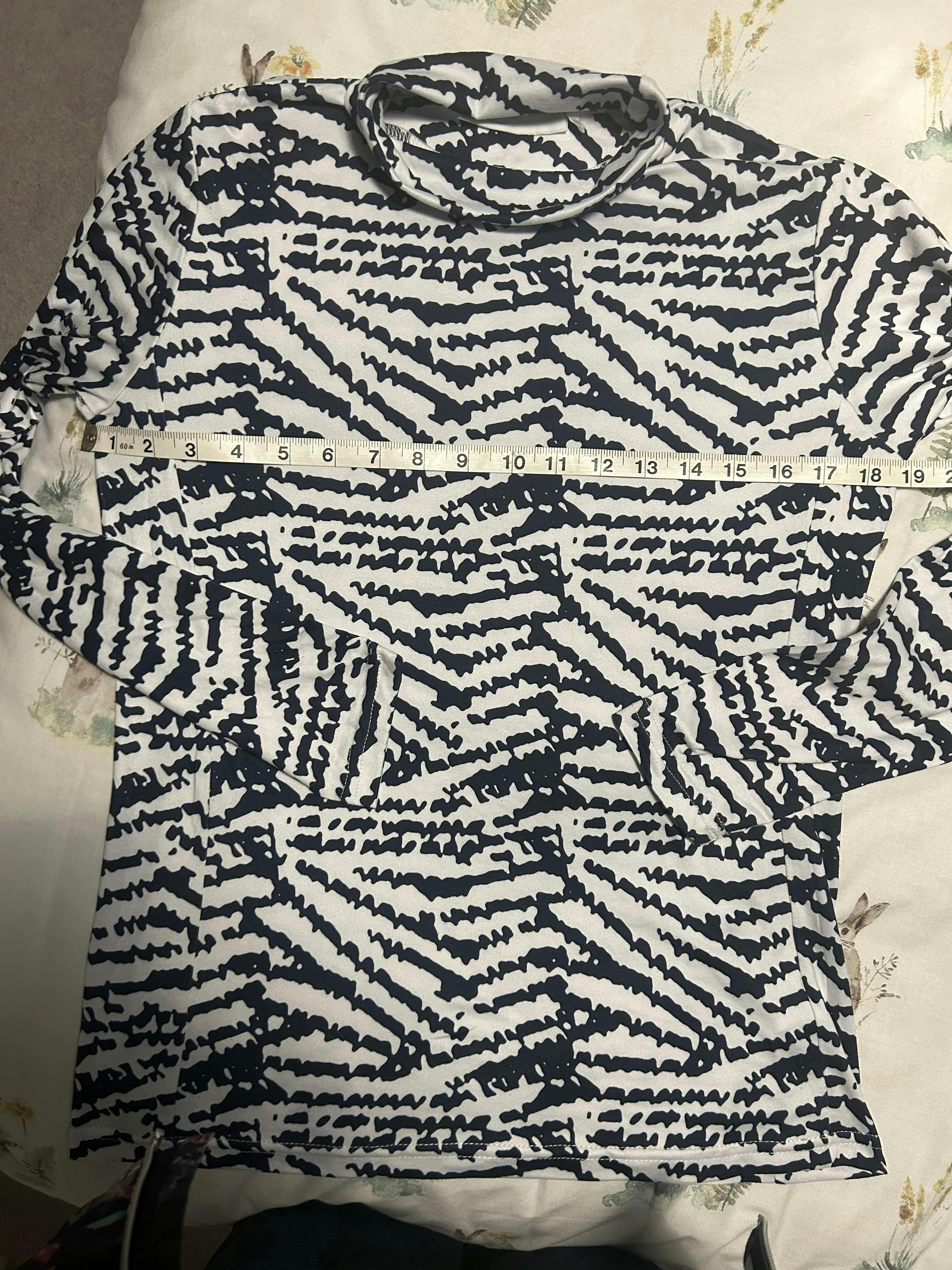 Love the navy and white print. I bought the medium size as it says 34.2 inch chest but after wearing a couple of times even before washing the neck became really baggy and the chest size of the garment after cold washing has now increased to 38 inches ! It certainly isn’t snug. Very disappointed as this was meant to be a base layer not a base camp tent