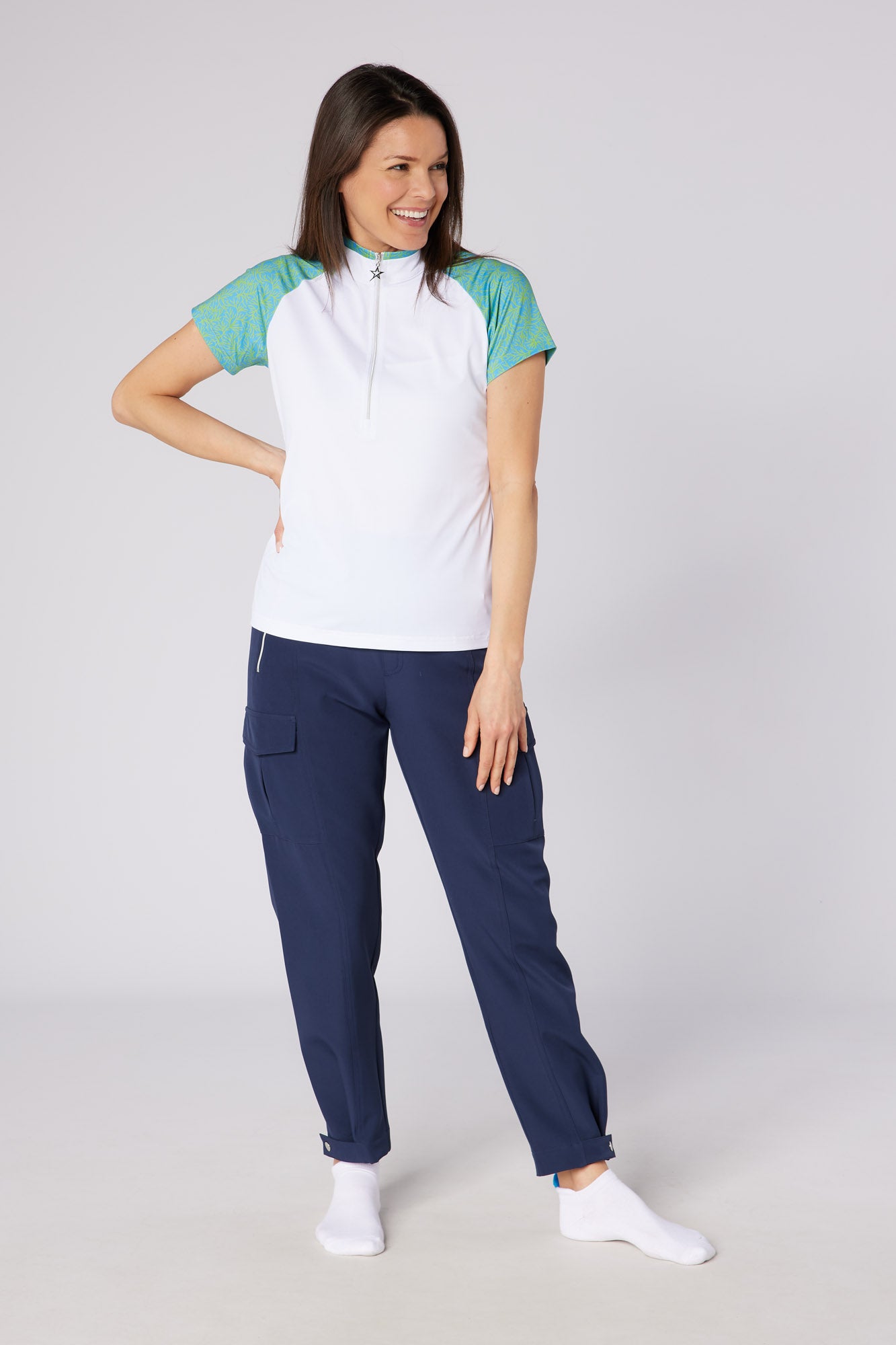 - Contrast pattern Neck & placate with popper detail