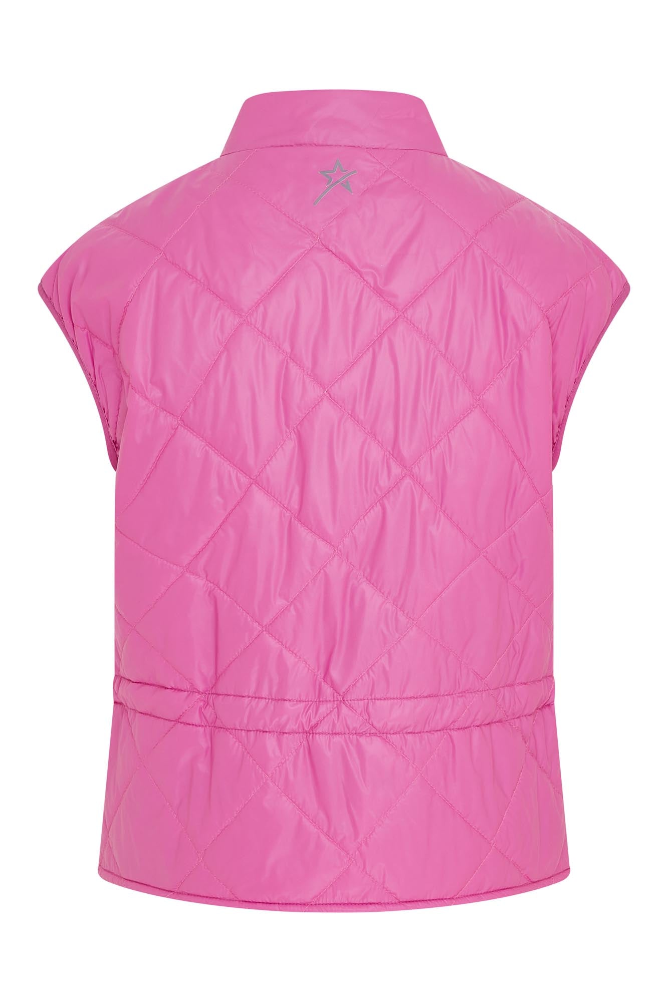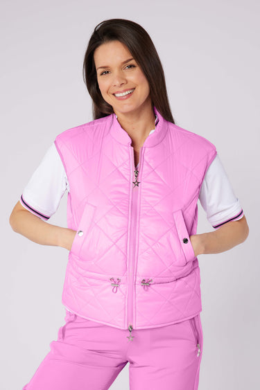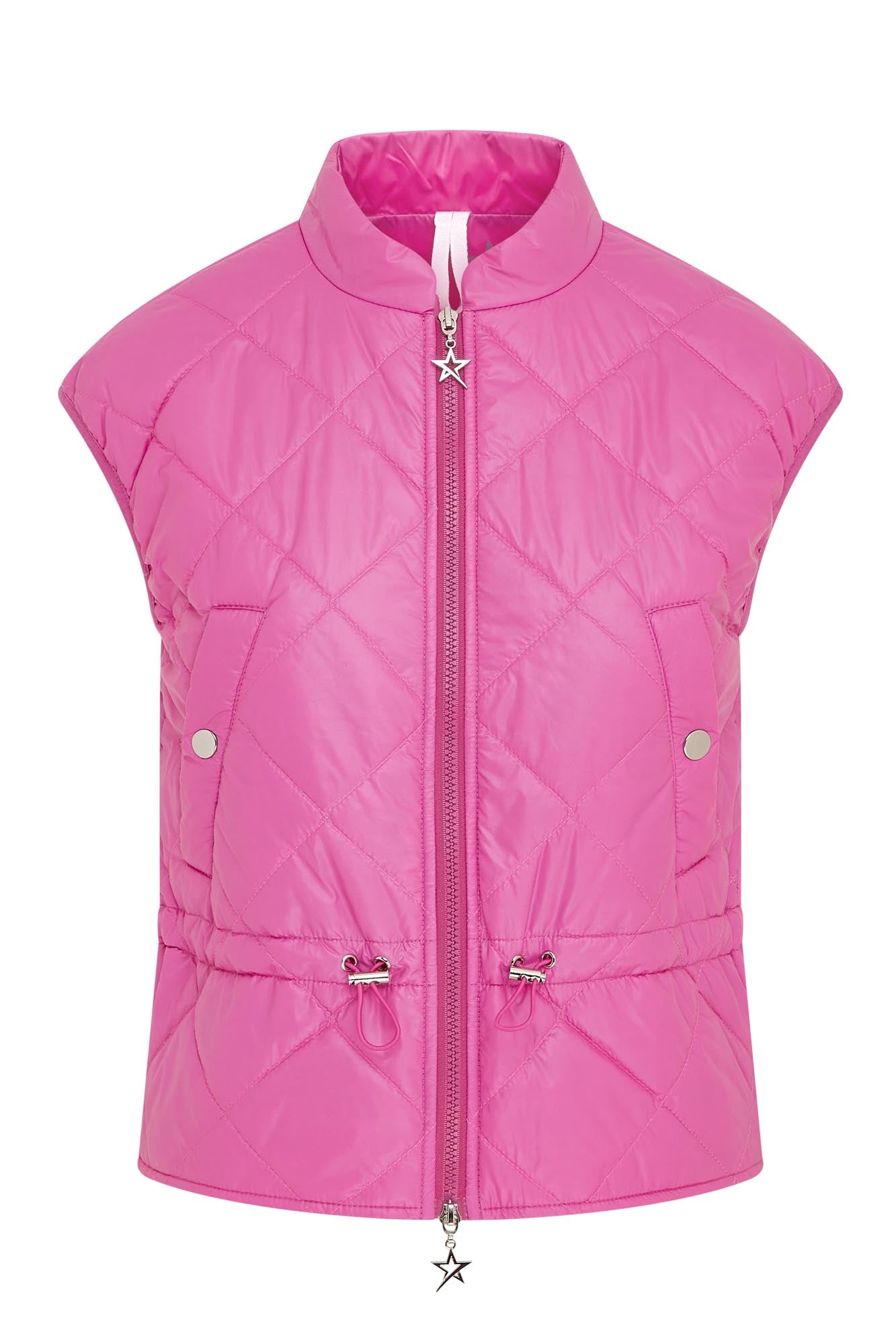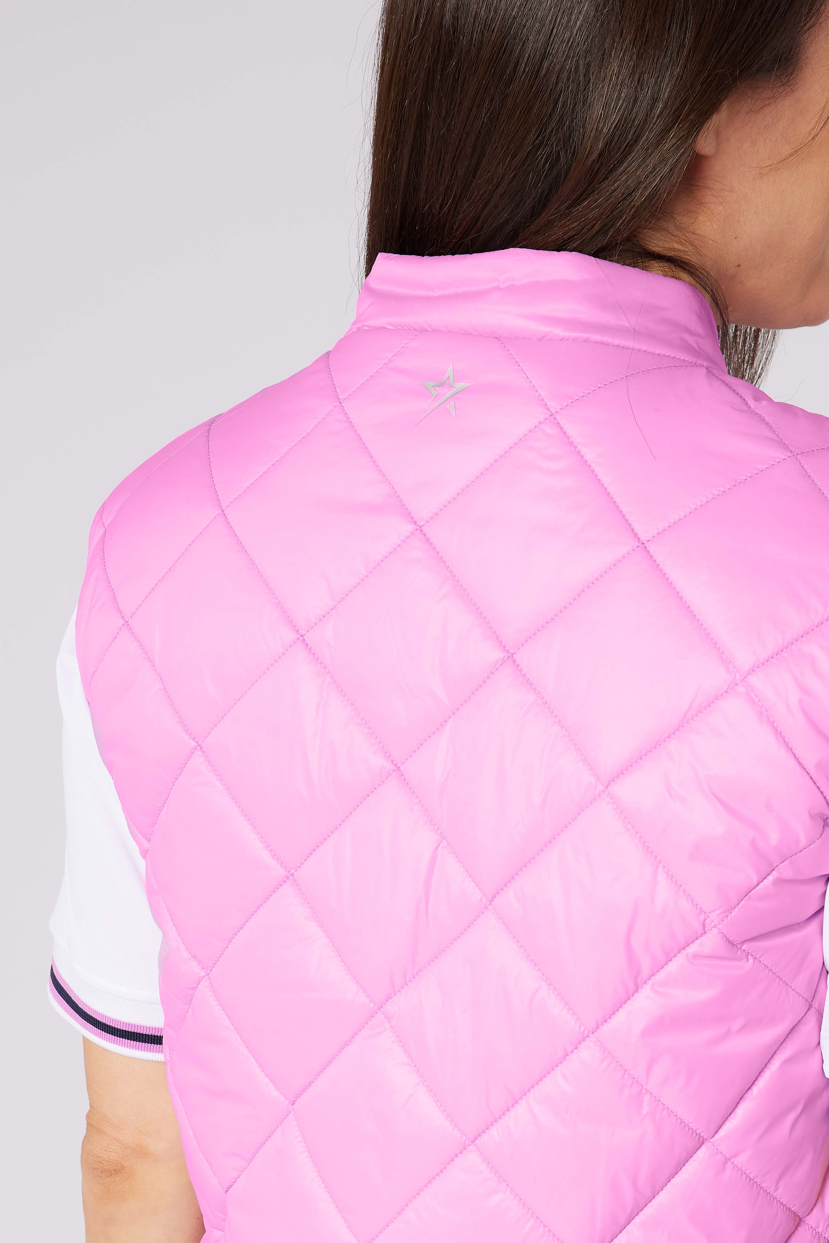 This stylish, lustrous ‘heat-tech’ quilted padded sleeveless vest is insulated with 100% recycled eco synthetic fibres that are lightweight, water-resistant, and warm! Featuring a lower styled flat collar to reduce layers around your neck, this piece concentrates on style, comfort and the warmth of the body whilst still enabling you to play golf. It features two popper up front pockets for convenient storage pockets and a drawstring with cord stoppers at the waist to make a neat, fitted look.