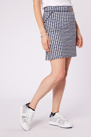 Introducing the Michelle - a stylish skort with a unique line flex pattern and integrated modesty shorts. This chic piece is a standout item for the summer season. It features an elastic band at the waist for comfort, accentuated with contrasting piping detail for a dash of elegance.