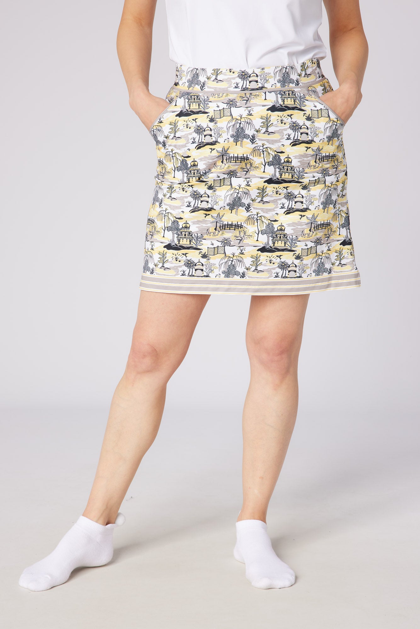 Introducing the Reef - a stylish skort with a unique line flex pattern and integrated modesty shorts. This chic piece is a standout item for the summer season. It features an elastic band at the waist for comfort, accentuated with contrasting piping detail for a dash of elegance. It's not just about looks; the comfort fit ensures you feel as good as you look.