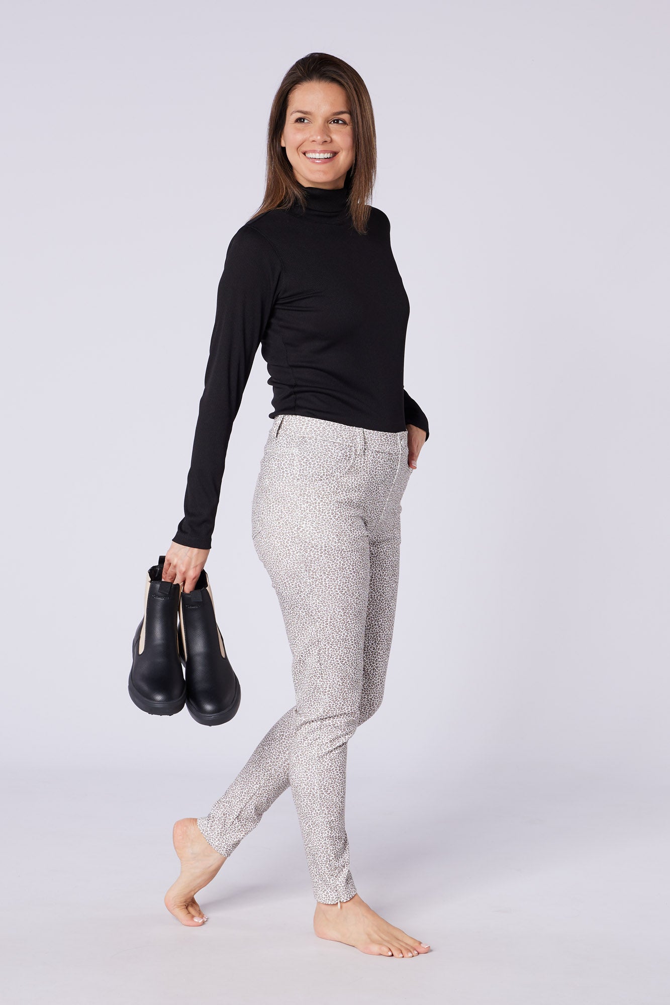 Sculpted for a sleek fit, these high-waisted trousers are crafted from an ultra-soft, stretchy jersey knit fabric for all-day comfort and flexibility. Featuring a zip at the ankle allowing a tighter fit, perfect to tuck into boots. Designed silver button on the front and belt loops allow this piece to be worn where desired, also featuring back pockets, these trousers are practical and made to move with you. Perfect tight fit allows ease when waterproof trousers are needed on top!