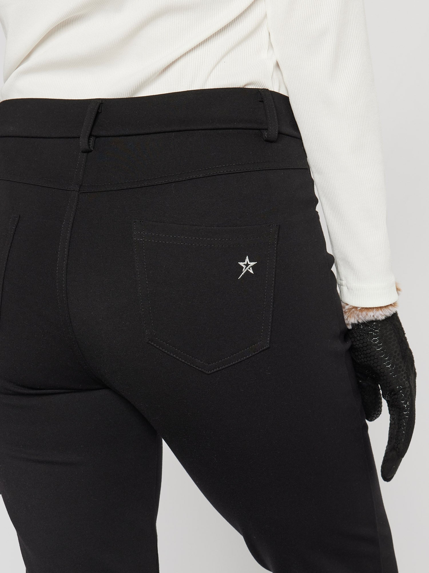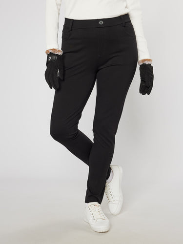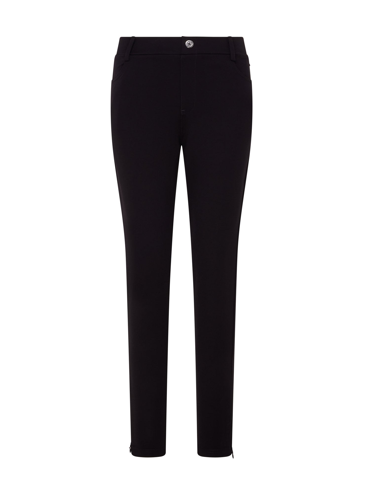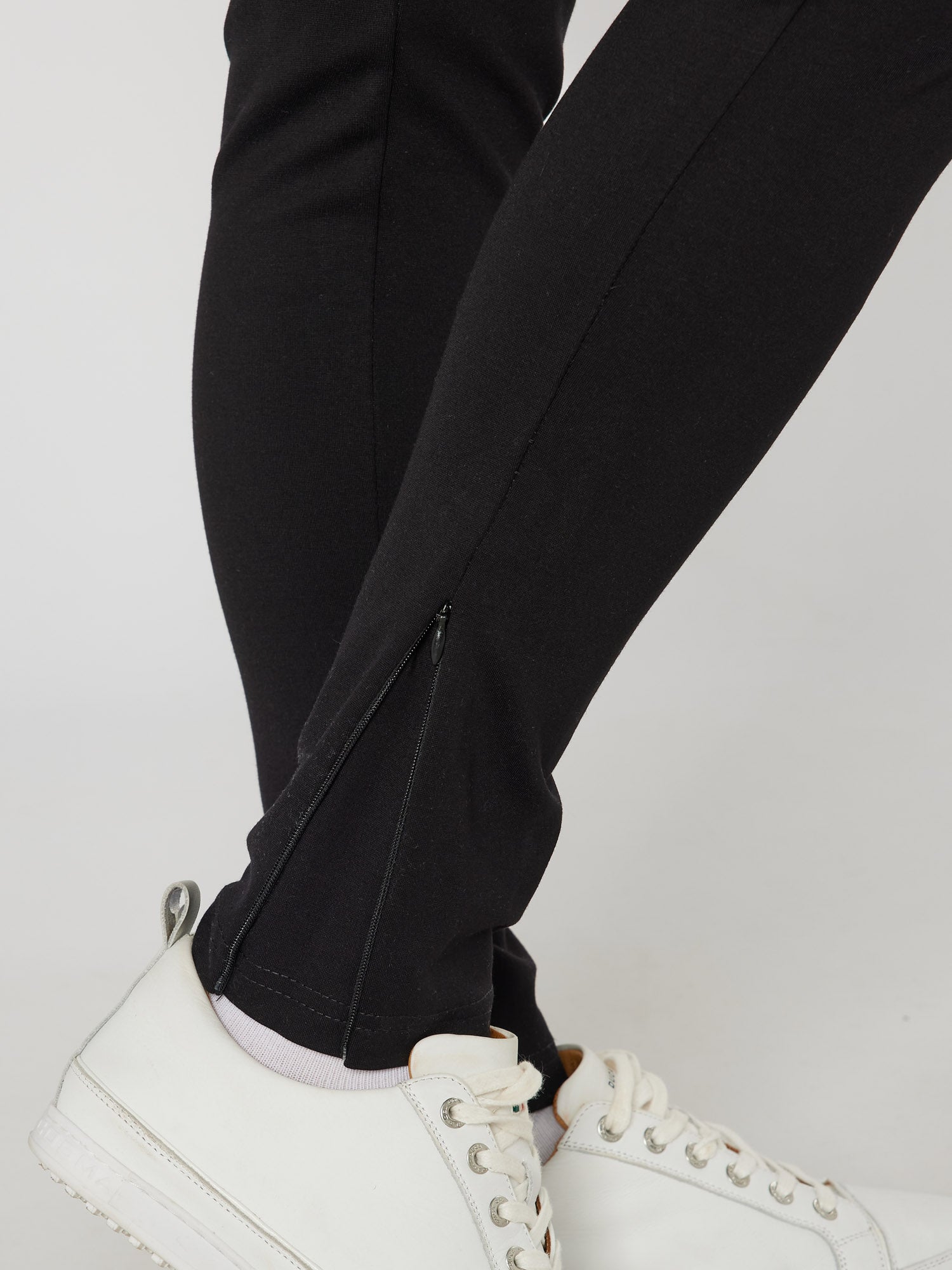 Sculpted for a sleek fit, these high-waisted trousers are crafted from an ultra-soft, stretchy jersey knit fabric for all-day comfort and flexibility. Featuring a zip at the ankle allowing a tighter fit, perfect to tuck into boots. Designed silver button on the front and belt loops allow this piece to be worn where desired, also featuring back pockets, these trousers are practical and made to move with you. Perfect tight fit allows ease when waterproof trousers are needed on top!